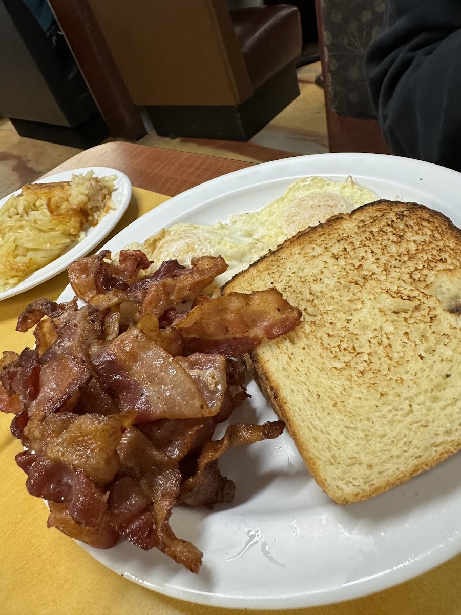 This place came up on Google maps when we were looking for a place to eat breakfast. Excellent choice! It looks like a little 'hole in the wall' place, but it is bigger and better than it looks at first glance. Our waitress was great; she'd been working there 17 years... so far. Let me tell you that the portions are huge and the prices are beyond reasonable. I asked for a side of bacon. And I got a plate FULL, probably a half a pound or more! Anywhere else I would have received 2 to 3 strips. There were five in our party: 6 meals, 2 extra sides, 5 drinks - cost 54. I thought this was incredibly reasonable. I live two states away, but if I ever venture this way again, it's a definite stop!